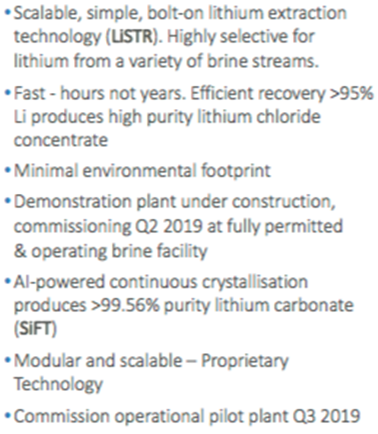 This means that no additional energy is required; the reaction kinetics for the adsorption is suitable. The process is capable of reducing the time required for Li extraction from many months (with the evaporation ponds) to hours, and is capable of producing a high-purity lithium chloride solution for further processing into battery quality compounds. The LiSTR process is designed to be scalable at each stage, from bench scale—mini-pilot-demonstration—commercial. We are using technologies and processes used in other industries; we are not reinventing the wheel, just turning it.