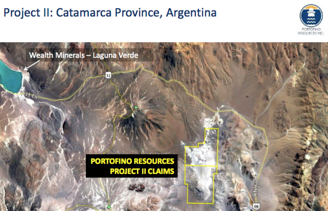 Portofino can acquire up to an 85% interest in a project called Project II, a brine project located ~10 kilometers (10km) from the Chile border, ~27km east of Wealth Minerals Ltd.'s (WML:TSX.V; WMLLF:OTCQX) Laguna Verde project and ~65km northeast of Neo Lithium Corp.'s (NLC:TSX.V) 3Q project. Project II encompasses a 3,950 ha claim block.