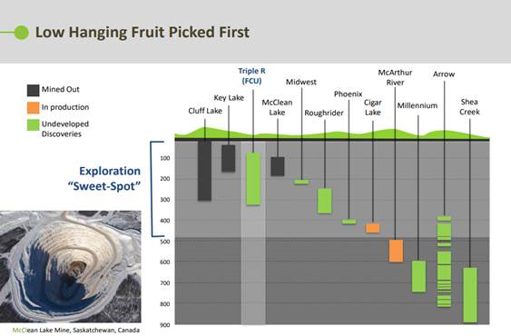Our PLS project that hosts the Triple R deposit in Fission Uranium is a great example of a near-surface deposit. The mineralization starts at 50 meters below the surface, so 150 feet below the present-day surface is where the high-grade mineralization starts. That makes it a potentially open-pit deposit, which is generally low cost and gives you a lot of flexibility.