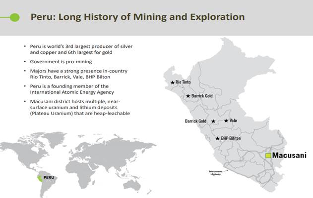 Ross McElroy: Peru is a really interesting area. Where our projects are is called the Macusani Plateau, located in southern Peru, near the Bolivian border. The Macusani Plateau has shown at least over 100 million pounds in near-surface uranium deposits.