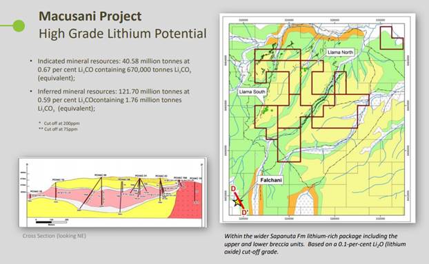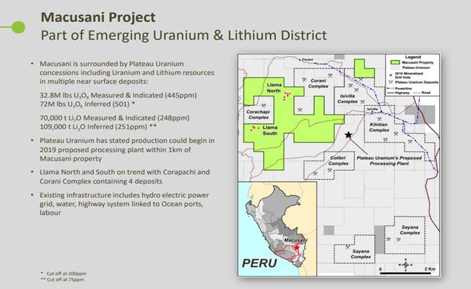 However, even more significant, Plateau made a discovery of high-grade lithium in the same area, and in fact, that's within five kilometers of our southern property boundary on our Macusani plains. Not only do we have the potential now to host near-surface uranium deposits, and we have shown in fact that we do have mineralization on our property for uranium, we've mapped it, we've drilled, we've trenched and found high-grade uranium, but now the potential's there for hosting high-grade lithium.