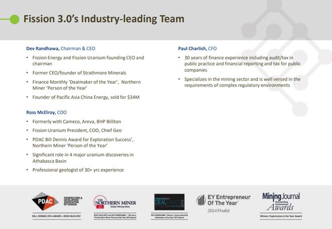 Ross McElroy: The management team is composed of our CEO Dev Randhawa and chairman. I am the chief operating officer, and also the chief geologist. We have maintained the same structure that we have in Fission Uranium, is the same that we have in Fission 3.0. It's a fairly lean team. Phil Morehouse is president of Fission 3.0. We kept a pretty lean mean machine in Fission 3.