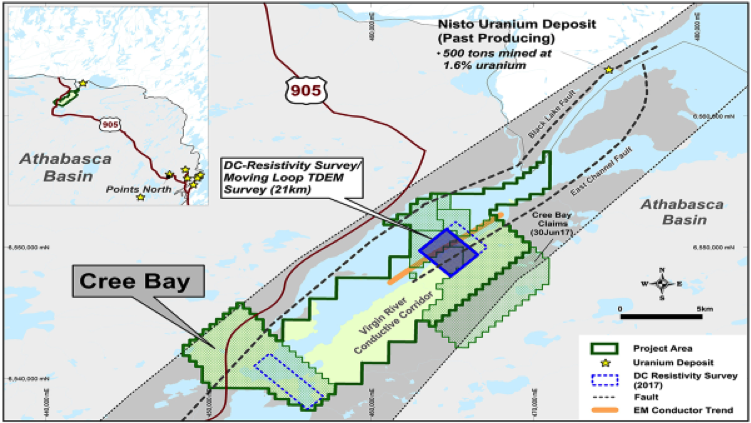 Ross McElroy: Our target on Cree Bay is along a major structural zone called the Virgin River shear zone. This is a big geological feature that cuts right across the Athabasca Basin from north to south. Athabasca-found uranium deposits are often associated with these major features, such as the Virgin River shear zone. And, in fact, along that shear zone there's the path-producing Nisto mine, which delivered high-grade uranium. And that old mine is located just seven kilometers along strike to the north of the Cree Bay project. So, we do know that this is a known feature that does produce high-grade uranium, and Cree Bay is situated right across the Virgin River shear zone.