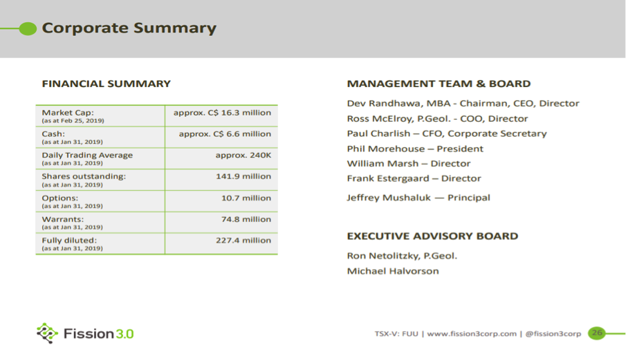Ross McElroy: Based on February's numbers, Fission 3.0 has a market cap of about 16.3 million dollars. We currently have $5.5 million in the treasury. We trade about 240,000 shares a day. We have 142 million shares outstanding and 227 million fully diluted shares. I think the important thing people want to take away from that is that Fission 3.0 has a significant amount of capital in the treasury. That allows us to do what we do best, which is to explore on our properties and hopefully make discoveries.