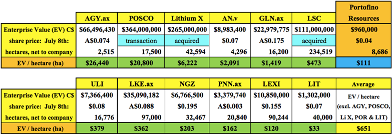 The average ratio of Enterprise Value to property size (excluding AGY.ax, POSCO, Lithium X, POR.v and LIT.v) is $651/ha, six times that of Portofino. I excluded AGY.ax & LIT.v as outliers. That average of $651/ha is going to move higher as several companies drop land packages in the next 6–12 months.
