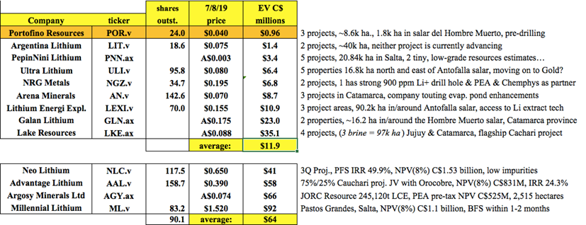 In looking at the 13 names on the chart—where their properties are, the number of recent press releases and their cash balances—there are several that I think are LESS likely to survive as lithium juniors with projects in Argentina than Portofino. Yet, Portofino has an enterprise value that's about 90% below the average enterprise value of [LIT.v, PNN.ax, ULI.v, NGZ.v, AN.v, LEXI.v, GLN.ax and LKE.ax].