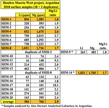 Last year, 18 near-surface samples were taken, plus two duplicates, on the two concessions that total 1,804 hectares. The top three samples averaged 906 mg/L Li and had a low average Mg:Li ratio of 1.8 to 1.