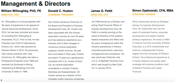 Following behind much larger companies has its advantages. Management at Cypress, most notably CEO Bill Willoughby, who's a PhD mining engineer with nearly 40 years' experience, is learning a great deal from technical press releases and reports filed by Ioneer, Bacanora and Lithium Americas. Management is learning what to do, but also what not to do.