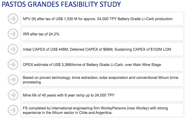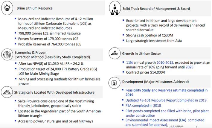 Millennial's BFS describes a lithium brine project that could reach commercial production in 2021. A pilot plant will be up and running later this year. Off-take discussions are well underway, and management's goal is to have project financing arranged by year end. These are exciting times for the team.