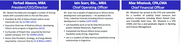 Farhad Abasov: We have an excellent and experienced team in place; both on the capital markets side and especially within our technical team. We have been a part of numerous mining successes including multiple M&A transactions. Given the strength of the Pastos Grandes project, we've been able to attract a world-class mining team; with experience in lithium project development, mining and processing. I invite readers to please visit our website for full biographies of our team.