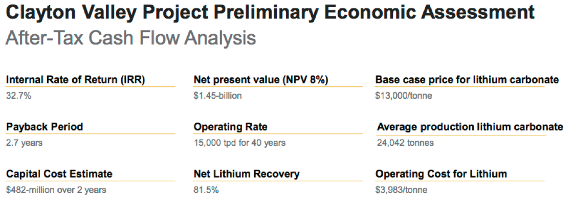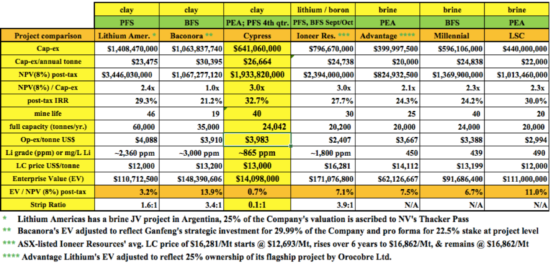 Finally, readers should note that the Clayton Valley project has a strip ratio of 0.1 to 1. The other three projects with strip ratios average 3.0 to 1. Cypress has 1/30th the strip ratio of its unconventional peers!