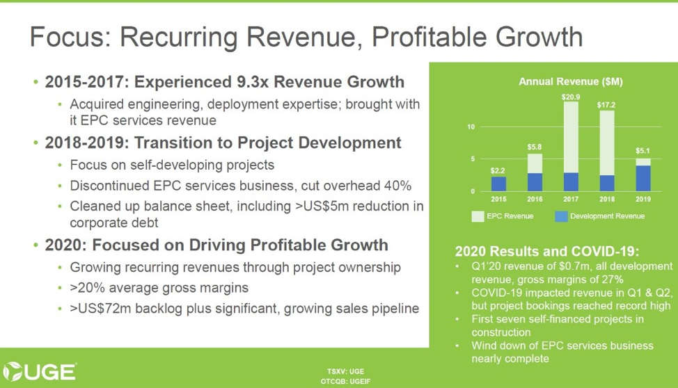 - The company's revenue pivot (exiting lower margin business) had a short-term adverse revenue impact. UGE's revenue pivot away from the low margin EPC business to self-financed, "own and operate" projects has resulted in project revenue being recognized relatively later.