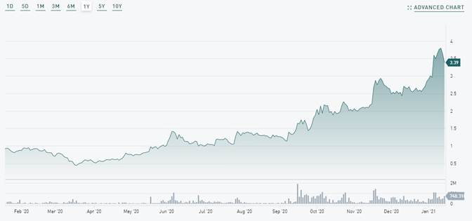 This all fueled a craze in lithium stocks in the fourth quarter of last year, with supply showing signs of tightening after several years of oversupply and the resulting low lithium product pricing in both spot pricing and contract pricing. A quick clarification: contract pricing is the actual price industrial scale off-takers are paying to industrial scale mining companies for large amounts of lithium products, but the pricing is very hard to track, and spot pricing is the price smaller off-take parties pay to small scale producers, but which is better to track for market watchers like Fastmarkets, Asian Metals and Benchmark Minerals. As with uranium, another opaque market handling spot and contract prices, Standard Lithium benefitted handsomely as well from the renewed EV interest almost singlehandedly generated by Tesla, as can be seen in its chart: