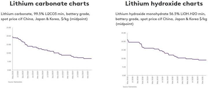 2. Sale prices of Orocobre, an actual lithium carbonate producer, which can be found in its financials (it also has very interesting further information regarding lithium market fundamentals on its website, which is recommended reading material). The H1 FY2020 sales price was US$6,157/t FOB, and the expected Q3 FY2020 sales price was US$5,000/t FOB. However, the realized sales price was just US$3,102/t FOB. Sales volumes were approximately 22% battery grade lithium carbonate and the remainder primary grade lithium carbonate.