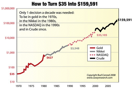 In fact, Casey Research chief economist Bud Conrad has shown how, by making just four trades over the last four decades -- into exactly the right sector at the beginning of a strong new trend -- you could have turned $35 into $150,000. Or, $350 into $1,500,000… or $3,500 into $15 million. And that assumes you don’t use leverage. Toss in some options or futures and the returns run exponentially higher. Here’s the chart.