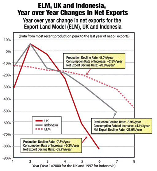 Which brings us to the Export Land Model (or, ELM as I will refer to it from here). The basic thesis expressed by Jeff Brown and other students of the ELM is that, to fully appreciate the impact of peak oil, you cannot look only at the production declines so presciently anticipated by ML Hubbard in 1956. You also have to look at the rate of local consumption and the importance of that consumption on the ability of a country to export their oil.