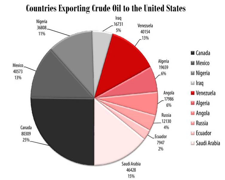 To better understand the reliability of America’s oil imports it’s helpful to see who America’s faithful oil-suppliers are – and who they aren’t. The chart shows that 54% of U.S. crude imports come from countries we consider Allies willing to work with the United States (shown in black and grey). Some 31% of imports come from Axis countries (shown in shades of red,) that have demonstrated hostility to America. Another 15% are from Saudi Arabia, a Wildcard we believe could go either way. It’s unsettling to note that almost half of U.S. imports come from countries that are either unfriendly or have potential to be.