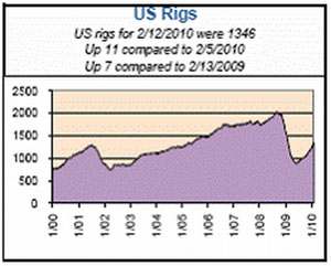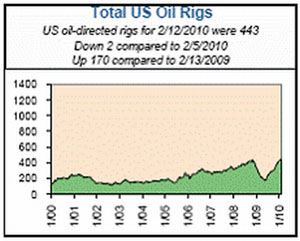The combined oil and gas rig count finally exceeded the prior-year level, now up by 7 from the same period in 2009. It rose to a 22-year high in 2008, peaking at 2,031 in the weeks ended Aug. 29 and Sept. 12.