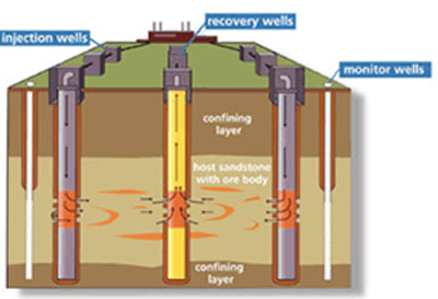 "In situ leaching (ISL)—also known as solution mining or in situ recovery (ISR)—involves leaving the ore in the ground, and recovering the minerals from it by dissolving them and pumping the pregnant solution to the surface where the minerals can be recovered. There is little surface disturbance and no tailings or waste rock are generated. ISR mining comprised 26% of global uranium production in 2008" (World Nuclear Association).